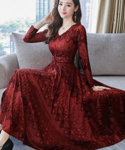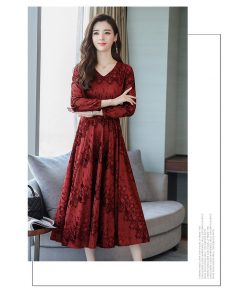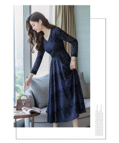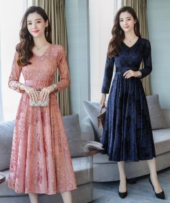 Đầm ren dài qua gối dáng xòe nhung mát mịn DR001